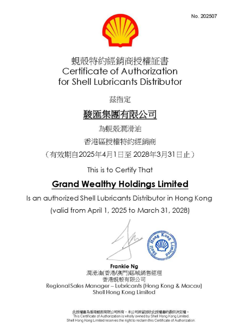 Awarded as Shell Authorized Lubricants Distributor for Hong Kong Market since Apr 2025